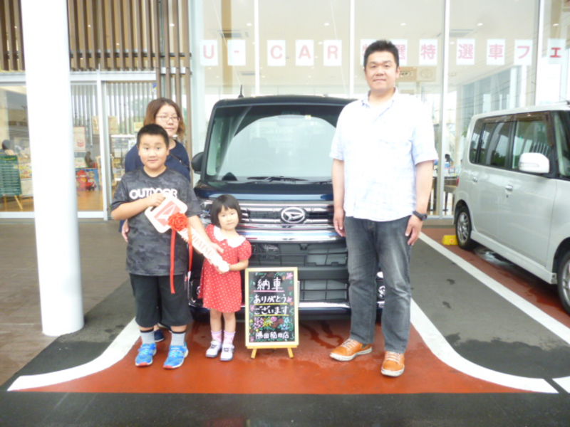 -お客様の声-初代タントを長年乗ってきたのですが距離数も走り、タントカスタムに乗り換えになりました。初代同様、大切に乗れる様にします。谷口さんを始め、スタッフの皆様対応ありがとうございました。この度ご納車させていただきありがとうございました。今後も末永いお付き合いをよろしくお願いいたします。担当:谷口