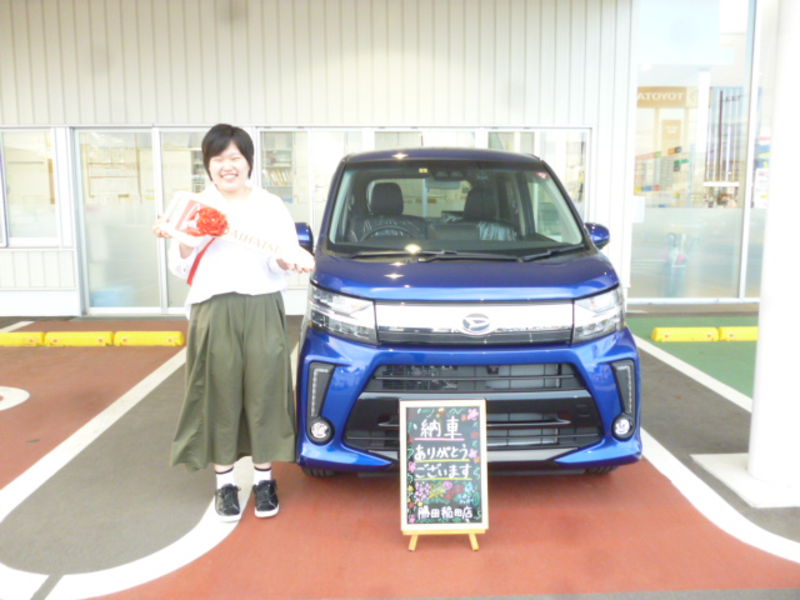 お客様の声「心から楽しみにしていた納車の日、朝からとってもわくわくしていました。とても丁寧に説明してくださって乗る心の準備ができました。今日から大切に乗ります‼」お車をとても気に入っていただけうれしく思います。ムーブカスタムでたくさんの思い出を作ってください。担当 住谷