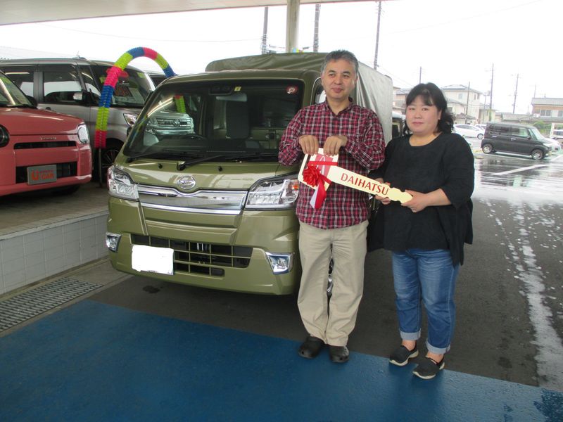 <お客様の声>農家ではありませんが、色々使いたいので今回購入を決めました。色が好みで選びました。一番の決め手は販売員さんの笑顔でした。ご納車おめでとうございました!こだわりのつまったハイゼット、とても素敵です♪これからもよろしくお願いいたします。担当長岡