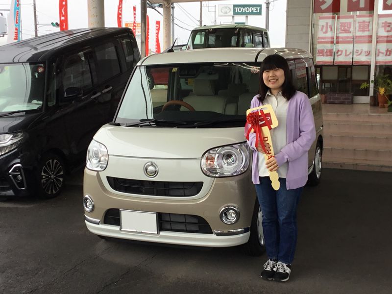 ~お客様の声~いい車、いい担当者さんに出会えてよかったです。大切に乗ります。この度は納車させて頂き誠にありがとうございました!ムーヴキャンバスとても良くお似合いです(^〇^)今後とも末永いお付き合いをよろしくお願いいたします。担当 加藤
