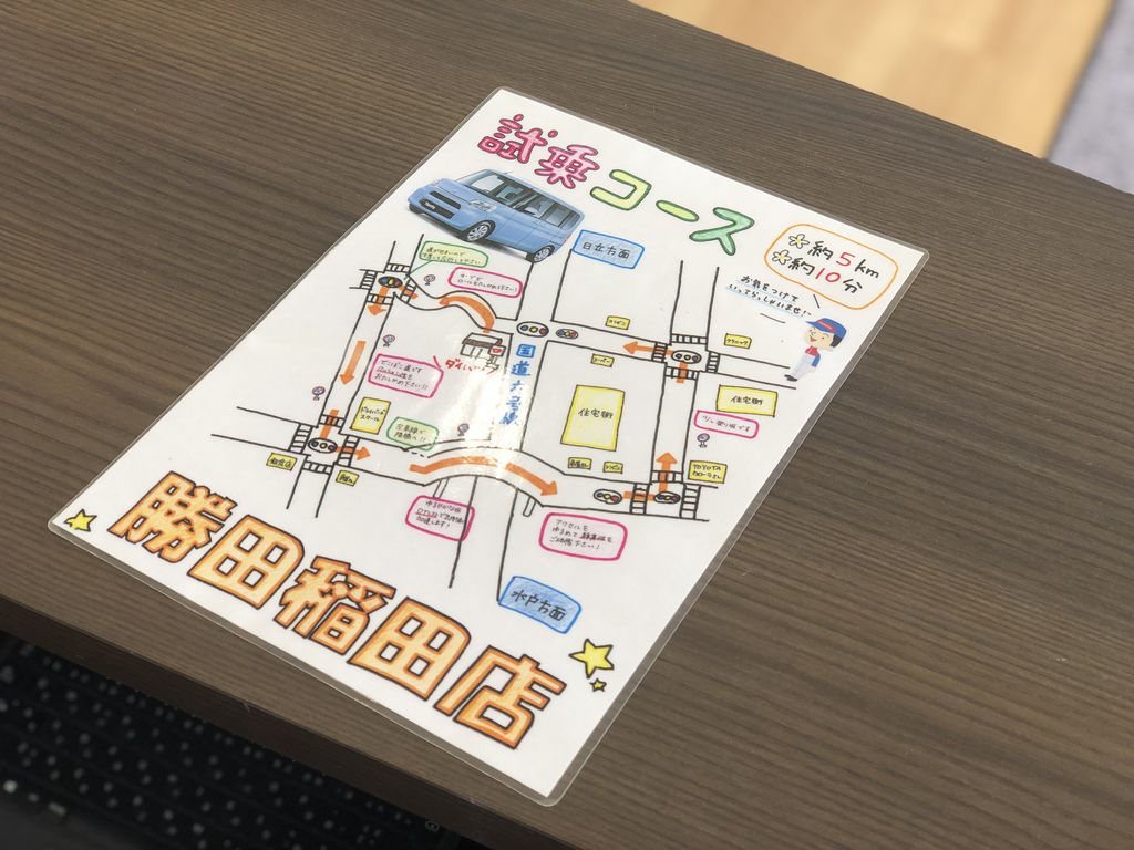 こんにちは!今回のブログは試乗コースのポイントについてです!勝田稲田店は国道6号線を挟んだ距離が約5km、10分程度の試乗コースをご用意しております。コースの途中には『カーブの多い道』『でこぼこ道』『登り坂、下り坂』などさまざまなシチュエーションが盛り込まれています!ダイハツ車の性能を存分に体感できるコースとなっておりますので、ぜひお試しください!!ご試乗の際には写真のような案内シートもお渡しいたしますので、どこがどのような道かもわかりやすくなっております😊