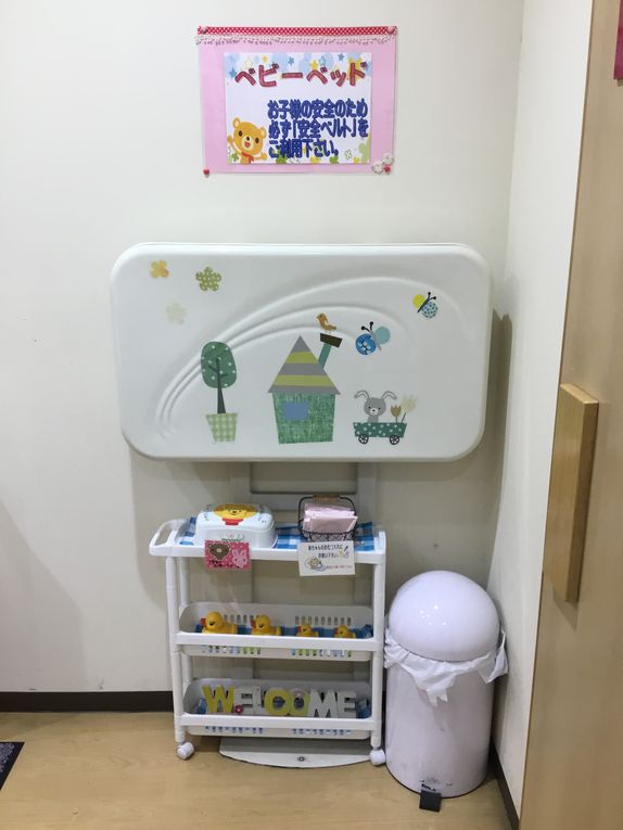 小さなお子さまのおむつ替え用のベッドにおしり拭きや専用ごみ袋も完備しております♪
