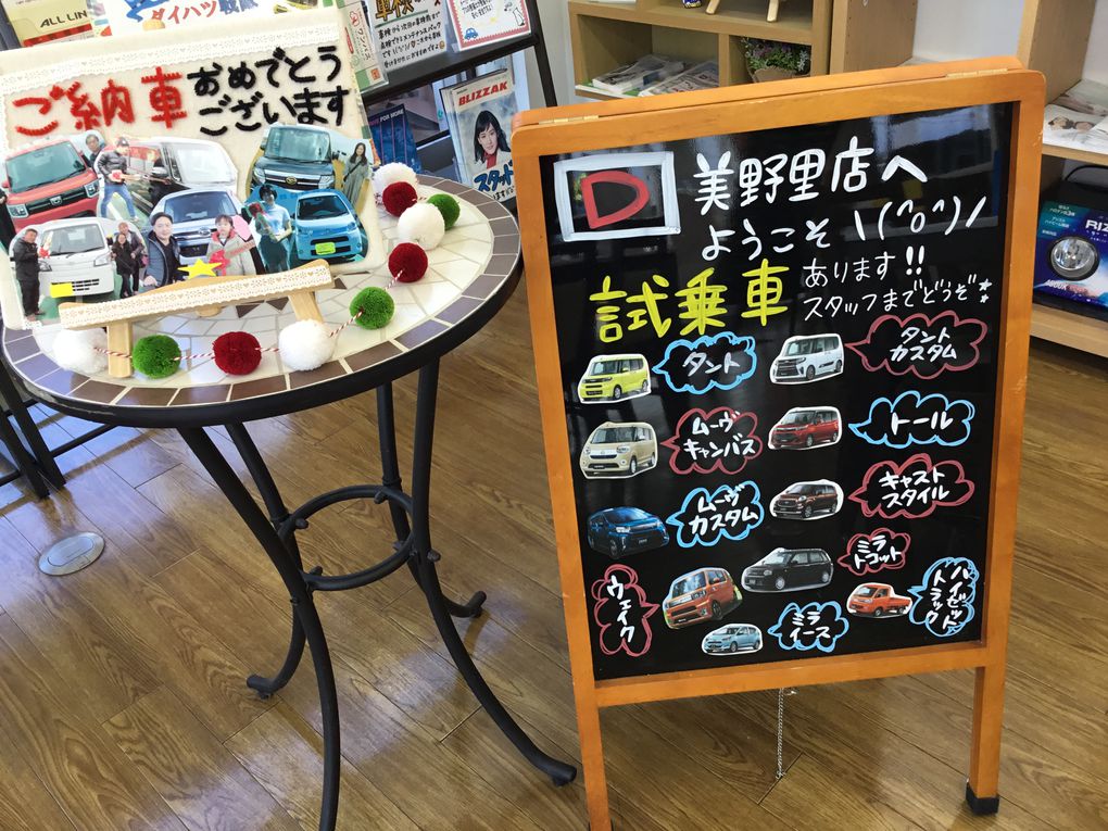 皆さんこんにちは(*´ω`*)茨城ダイハツ美野里店の渡辺です★最近風が強くて、寒い日が続いていますね(>_<)また冬に戻ってしまったかんじがしています…体調を崩さないように、ですね(´ω`)さて、今日は美野里店のおすすめコーナーを紹介します!なんといっても、美野里店は中古車が多数展示してあります。その中でも、最近は新型タントにナビ付きでお買い得なおクルマも多数展示してあります(●^o^●)ぜひ一度美野里店へご来店下さいませ★