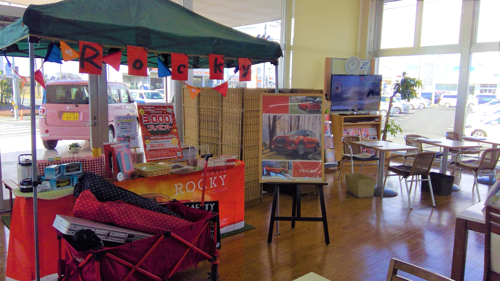 小型SUV・ロッキーの発表に合わせて、特別にショールームの一角にキャンプシーンを再現してみました☆(スタッフの私物を使って準備しました!)点検や車検の待ち時間にショールーム探索などされてはいかがでしょうか♪