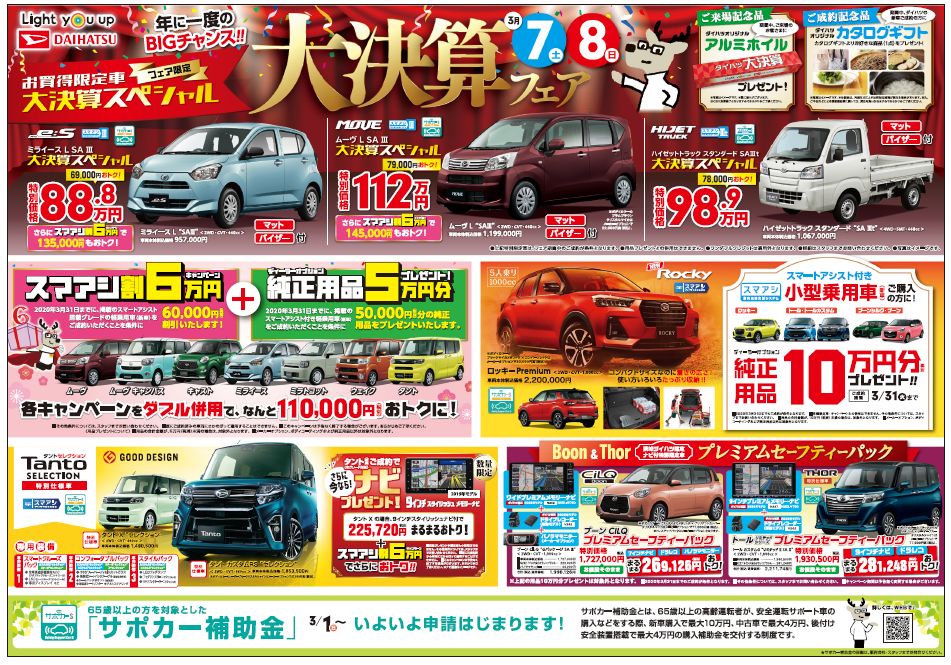 こんにちは!日立北店です!お車のご購入を考えている方!この時期がやってきました! 『大決算フェア』です!!!!!!!!!!!!㊗今なら、ディーラーオプション最大10万円分プレゼント!さらに!スマートアシスト付軽乗用車のご契約で、6万円引き です!!!!