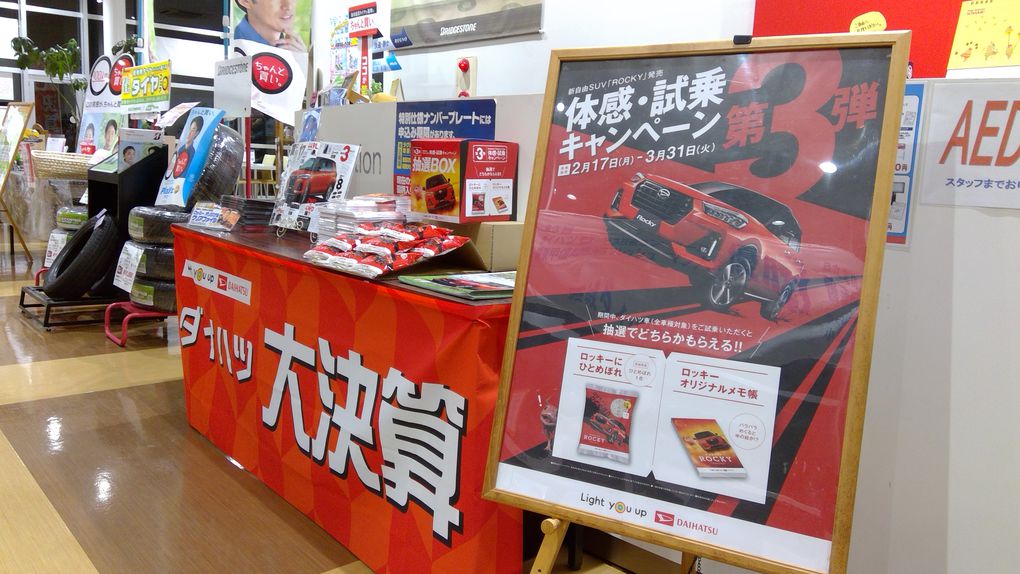 3/31まで試乗キャンペーン実施中!期間中ダイハツ車をご試乗いただくと、お米かメモ帳が抽選でどちらかもらえますよ(^^♪気になるお車がある方は、お気軽にスタッフまで!