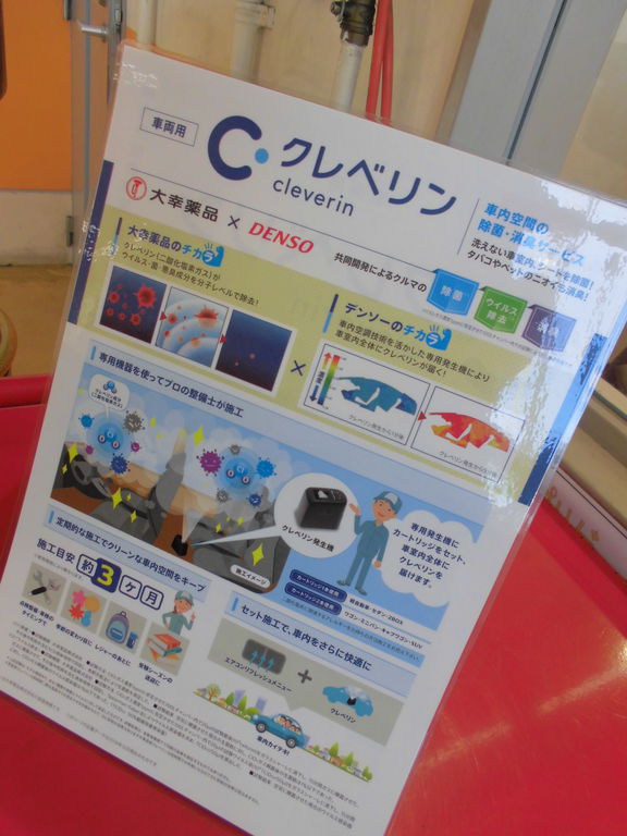 こんにちは。今日は、オススメ商品のご紹介です!!皆さま、クレベリンって知っておりますか??今の時期にはピッタリ!?車内空間の除菌・消臭サービスなんです!ただ、すべてが除去できるというわけではありませんのでご了承ください。でも、小さなお子様がいる、においが気になる、常に車を使用するなどにオススメになっております。ぜひご利用してみてください。