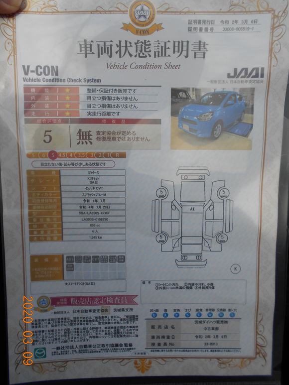 お車の状態も車輌状態証明書で詳しく提示してあります。