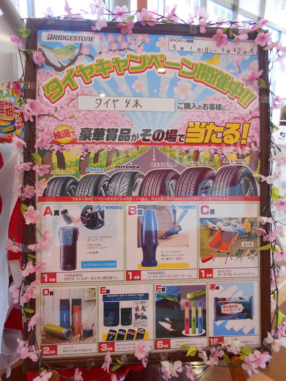 タイヤ4本購入で抽選豪華賞品をプレゼントしております。タイヤ購入と一緒にお土産をゲットしてください!