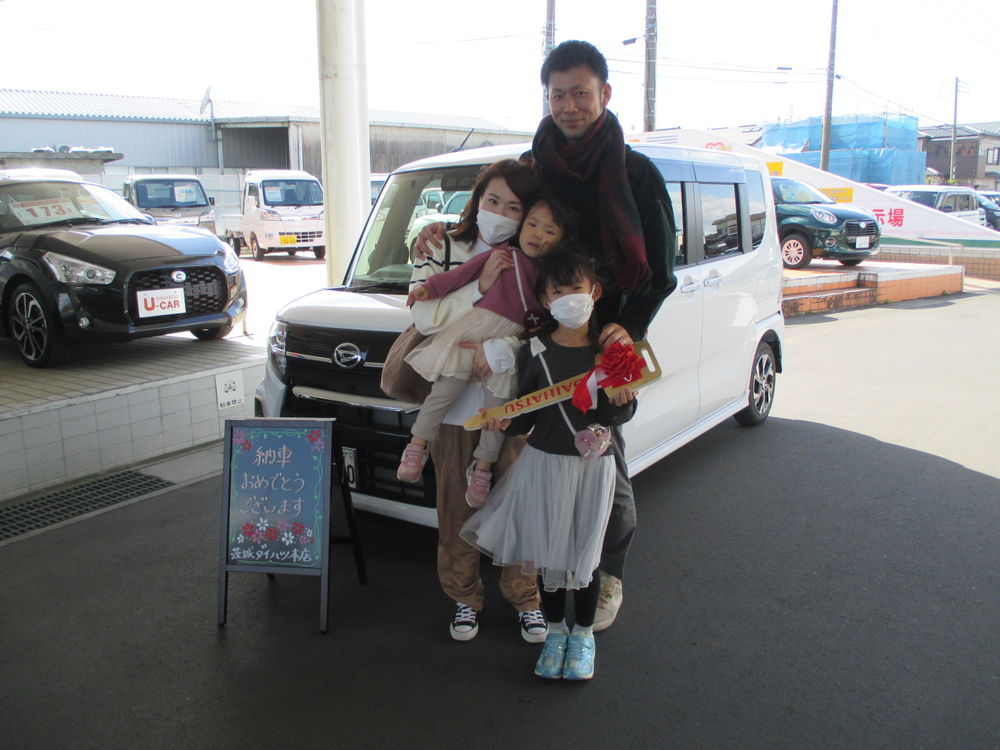 <お客様の声>とってもカッコイイ!!毎日の子供との送迎時間がより充実したものになりそうで楽しみです。黒井さんありがとうございました。こちらこそありがとうございます!これからもタントに乗ってたくさんの思い出作って下さい!担当黒井