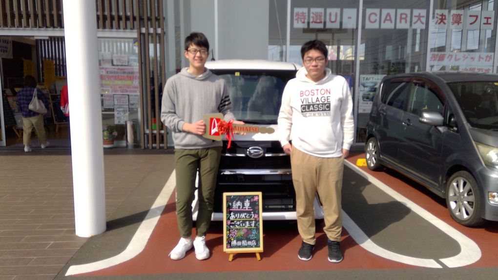 お客様の声「住谷さんの親切な対応で気に入った車が買えました!お世話になりました。これからもよろしく‼」この度はご納車させていただきありがとうございました。タントは次世代スマアシなど装備満載で安心安全な車です。気にいっていただけて私も嬉しいです。今後とも末永いお付き合いをよろしくお願い致します。担当 住谷