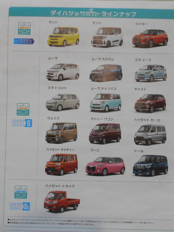 ダイハツで扱っております車種の補助金対象車種のラインナップです。ブーン・トール・ロッキーは10万円、その他の軽乗用車は7万円、軽貨物のAT車は7万円・MT車は4万円が対象となります。