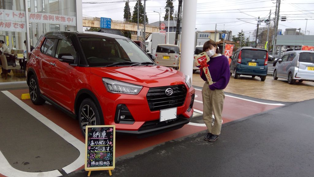 -お客様の声-初めての自分の車でとても嬉しい気持ちでいっぱいです。毎日楽しく乗りたいと思います。山本さんの親切な対応にとても感謝しています。初のマイカーにロッキーを選んでいただき、また、嬉しいお言葉を本当にありがとうございます(*^^*)赤いロッキーとってもお似合いで素敵です~♪今後も末永いお付き合いをよろしくお願いいたします。担当 山本