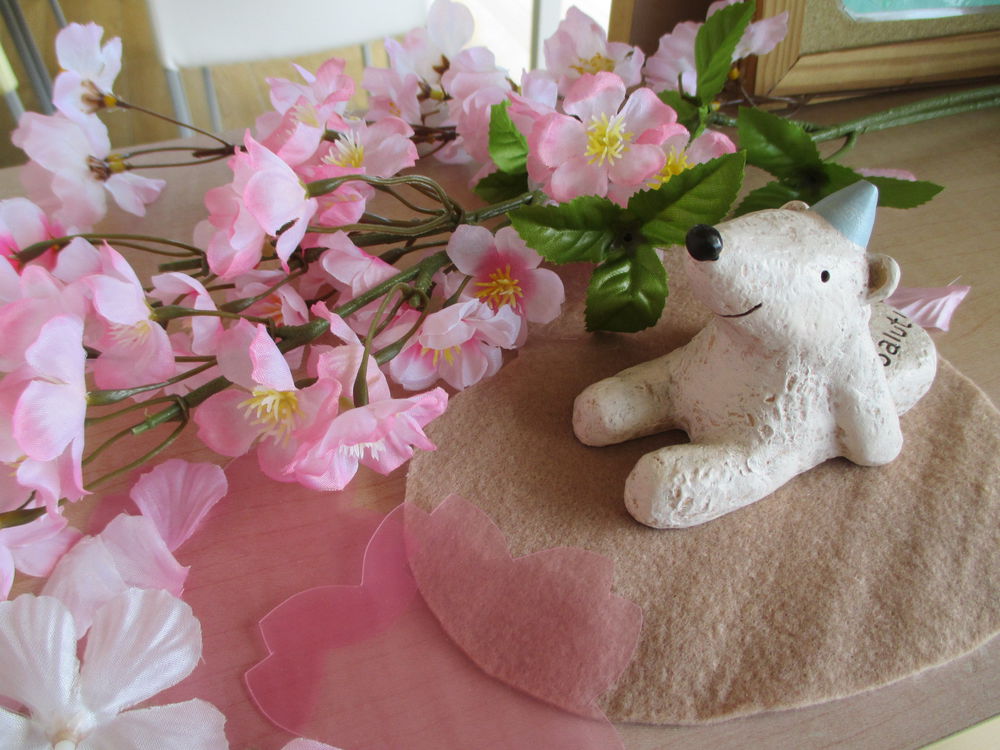 こちらはシロクマくん。足元の桜の花びらはクリアファイルを切って作りました。