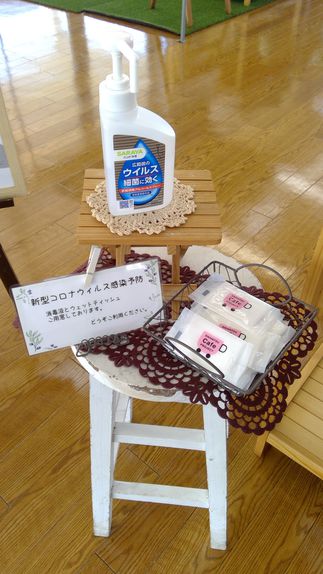 店舗入口に、アルコール消毒液とウェットティシュをご用意しております。