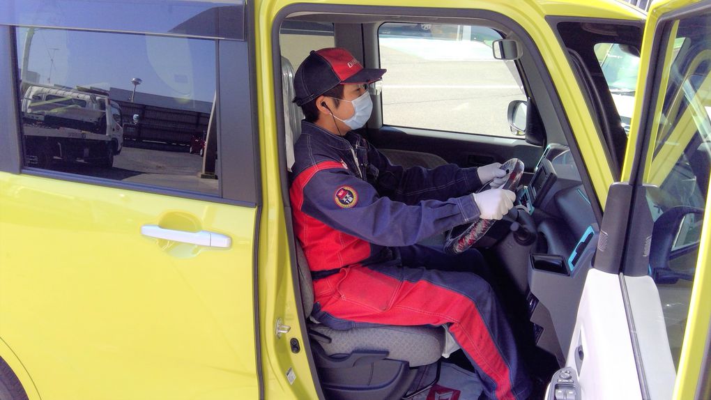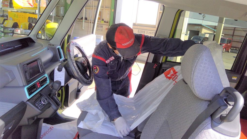 整備させていただく前に、ゴム手袋を装着し、シートカバー、ハンドルカバーを付けてお客様の安全、安心に考慮しながら作業しております。