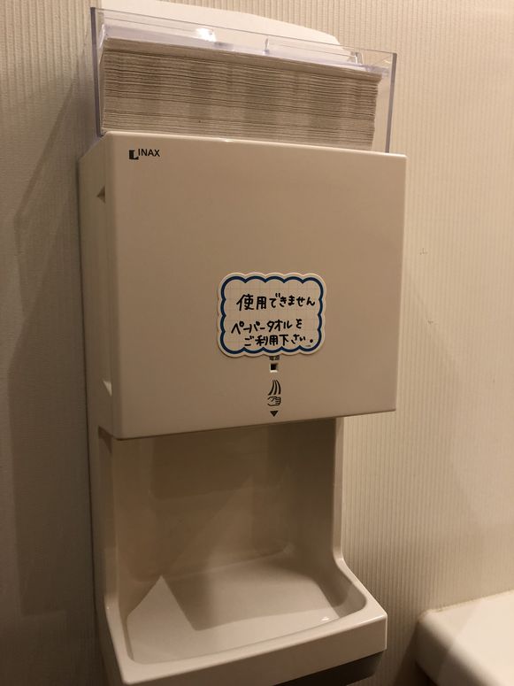 ハンドドライヤーの使用を一時中止させていただいております。 代わりにペーパータオルをお使いください。