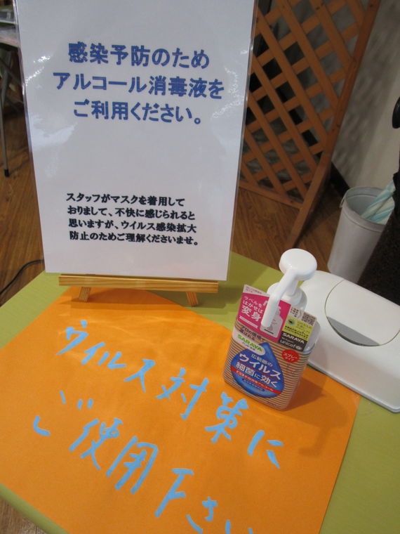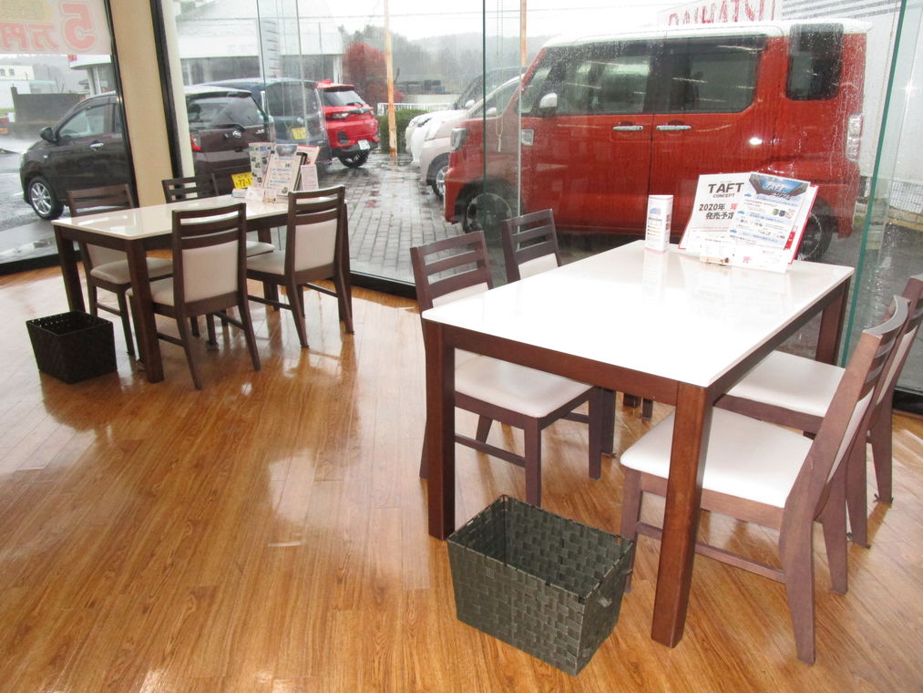 いつもダイハツのお店をご利用いただきありがとうございます。今回担当いたしますO(オー)です。どこのお店でも対応しておりますように感染予防対策として、店舗内の車を撤去しテーブルの間隔を広くとるようにしております。また、テーブル・イスの消毒はもちろんのこと、大切なお客様のお車もハンドル・シート・足元のカバーの取り付けなどの対策に取り組んでいます。スタッフはマスク着用で対応させていただいておりますのでご理解いただきますようよろしくお願いもうしあげます。