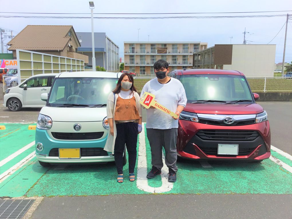 お客様コメント「夫婦そろっての新車です!」スタッフコメント「この度はご納車おめでとうございます。ご夫婦そろって2台の新車ご契約ありがとうございました。キャンバスとトールでスライドドアの2台なので、車もまるでご夫婦みたいになりましたね。優しいお客様にとてもお似合いです♪これからこの車たちとたくさん思い出作って下さい。宜しくお願い致します。」