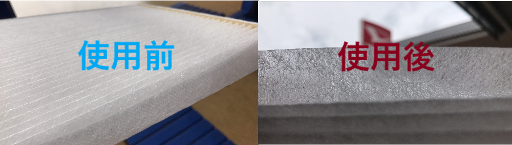 取り出したエアコンフィルターは新品と比べて汚れてますね~(-_-;)