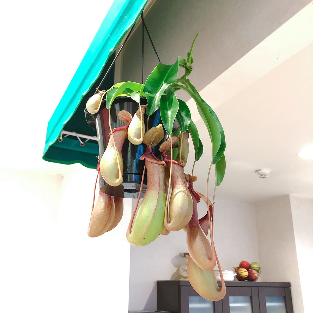 『ネペンテス』 ウツボカズラの一種です。葉先から伸びた蔓の先の捕虫袋で虫を捕まえます。
