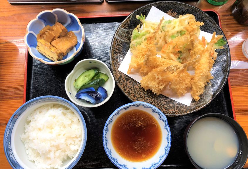 こちらの定食は、ハゼ・白魚・ワカサギ・川エビの天ぷら&かき揚げ