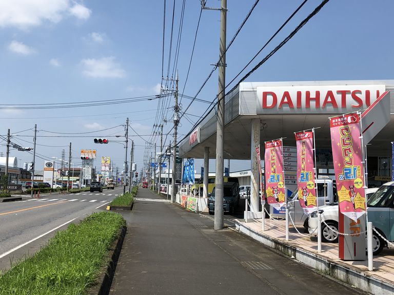 (西)いままでの写真と違う表情の西側の景色。店舗の前は、ディーラー、スーパー、飲食店が連なる大通りです。北に進むと125号線にぶつかります🚙
