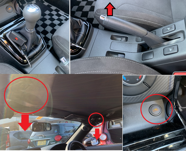サイドブレーキを引き・天井のバックルを外して・オープンランプが点灯したらサイドブレーキ下のスイッチを引くだけで
