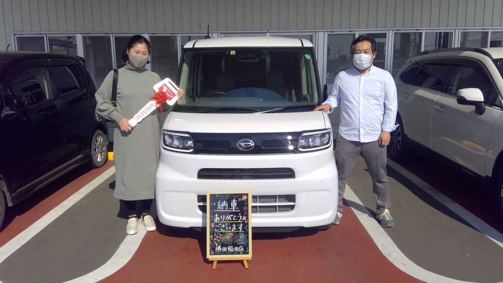 お客様の声「長年の夢だったTantoを購入することができました。これからTantoと一緒に出かけて楽しい思い出を作りたいと思います。大切に乗ります。ありがとうございます‼」この度はタントをご納車させていただき誠にありがとうございました。タントで思い出をたくさん作ってくださいね♪これからも末永いお付き合いをよろしくお願い致します。担当 住谷
