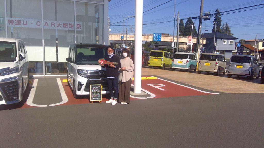 =お客様の声=納車をとても楽しみにしていました。大事に安全運転で乗って行こうと思います♪ご納車おめでとうございます。2トーンカラーのタントカスタムかっこいいです。これからも末永いお付き合いをよろしくお願いします 村松