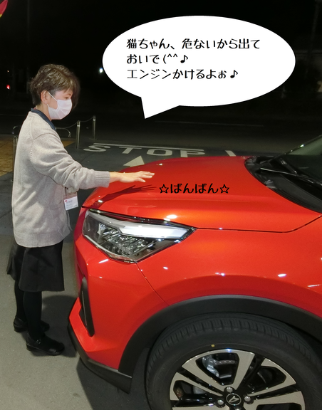 最近、気温もすっかり下がり寒い日が続きますが、皆様おかわりございませんか?最近の寒空の下、寒がりなのは人間ばかりではありません。一番身近な動物ですと、「猫」です。特に暖かいところを好み、寒い冬の時期は暖かい車の下やエンジンルームの中に潜り込んでしまうことも…お車に乗る際は、ボンネットを2回ほど「バンバン」と叩くことで車の下にいる猫やエンジンルームに入り込んだ猫に車が動くことをお知らせできます!是非、皆様もお車に乗る際は☆猫バンバン☆をお願いします。