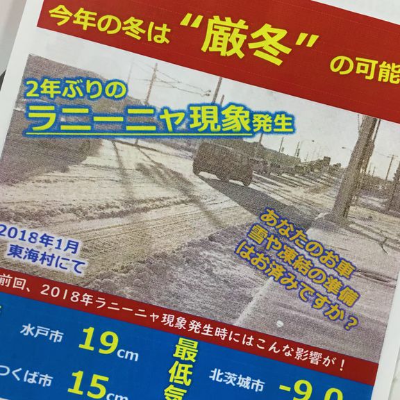 いつもお世話になっているタイヤ屋さんが、こんなチラシを置いていきました。ラニーニャ現象って…?熱帯太平洋の西部で海面水温が平年より高く、東部で海面水温が低くなり、その状態が一年ほど続く現象のことだそうです!難しい言葉だらけで分かりづらいですが、簡単に言うと夏がいつもより暑く、冬はいつもより寒い!という事みたいですね(;^ω^)💦と、いうことは…突然の雪や凍結に備えて、スタッドレスタイヤの準備をしておかなくてはいけませんッッ!!