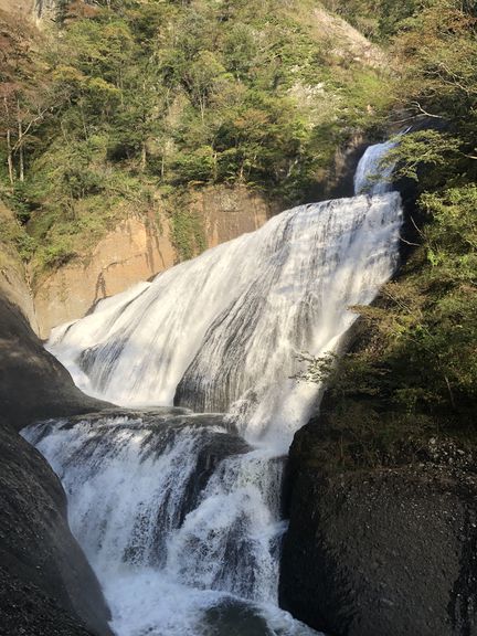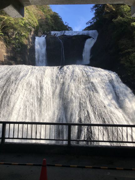 斜め下から見た、凍っていない袋田の滝です。凍り付いた滝やいかに????