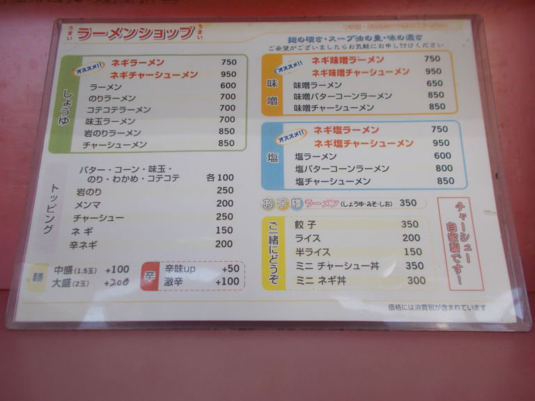 まず、お店に入ってメニューを見て味が、醤油、味噌、塩の選択!