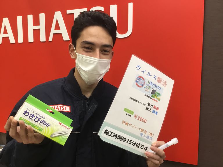 こんにちは!ダイハツ竜ケ崎店サービススタッフSです。今回ご紹介させて頂くのはウィルス対策にも使える商品です。1つ目は【クレベリン】車内に二酸化塩素を専用の器具で巻いてウィルスを除菌、消臭することができる。2つ目は【わさびデェール】エアコンフィルターに本体を付けてエアコンから出てくる風を抗菌、消臭することができる。わさびの匂いは残らないので大丈夫です!どちらも短時間で作業ができるので点検・車検と一緒にどうですか?