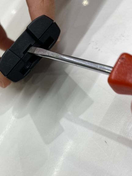 小さめのマイナスドライバーが入るくらいのくぼみがありますので、そこにマイナスドライバーを差し込みます(※この時、開閉ボタンを下向きにしながら開けると良いです。また、画像は分かりやすいようにそのまま差し込んでいますが、実際に差し込む場合は保護用の布などと一緒に差し込むと傷防止になります!)