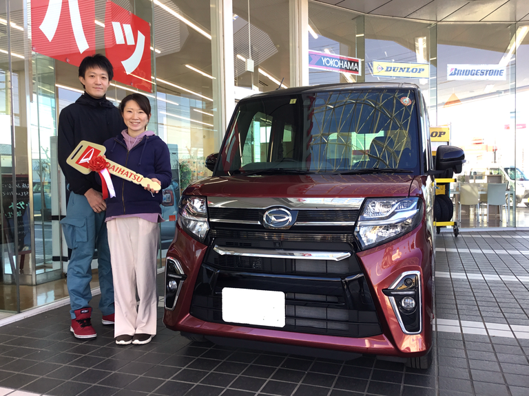 【お客様コメント】黒×赤のタントカスタムにしました!ナビの画面も大きくて、見やすそうです♪【スタッフコメント】ご納車ありがとうございました!ご夫婦での久々の写真の機会になったとのことで、私も嬉しかったです♪今後ともよろしくお願いいたします! 担当:霜田
