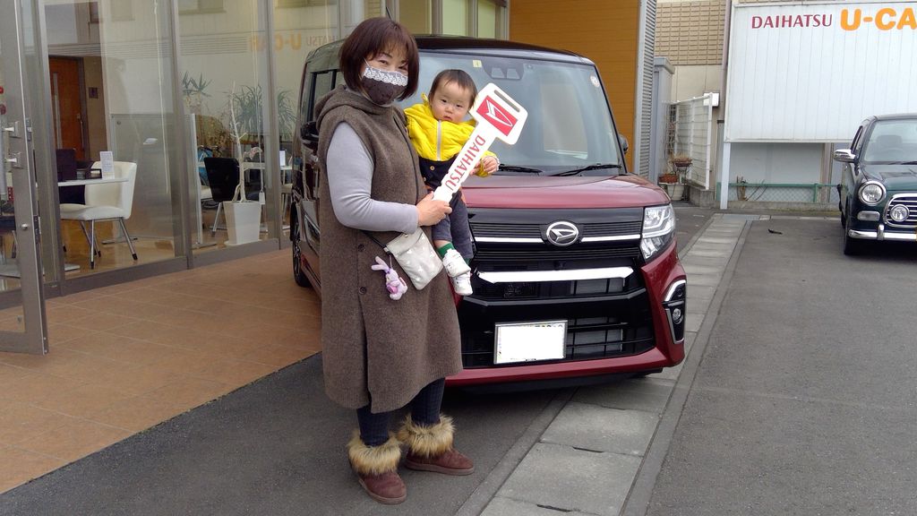 ~お客様の声~タントの進化にビックリ!!色もかわいいです。大事に乗ります!この度は、ご納車させていただき誠にありがとうございました。今後とも末永いお付き合いよろしくお願いいたします。担当:谷口