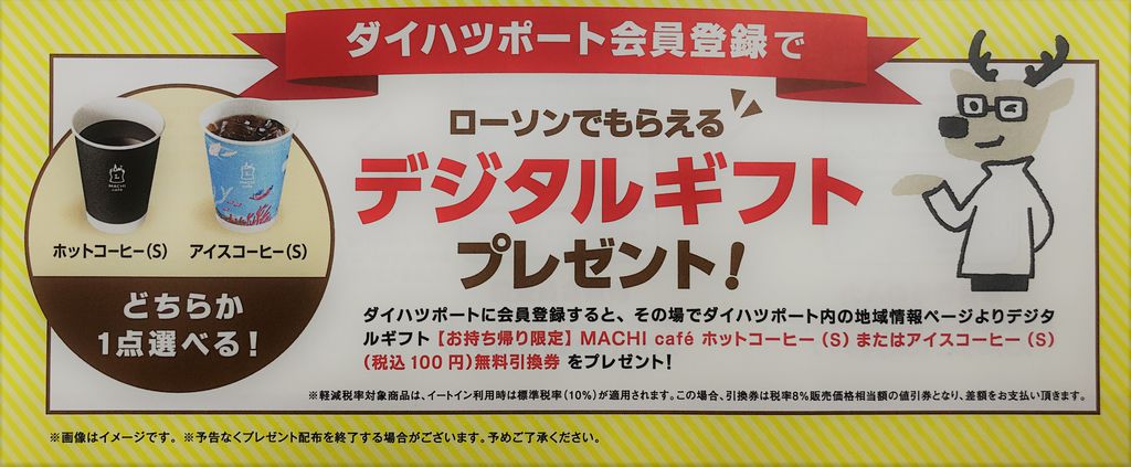 そして今ダイハツポートにご登録いただきますと、コンビニエンスストアでコーヒーがもらえるデジタルギフトもプレゼント実施中です!!!