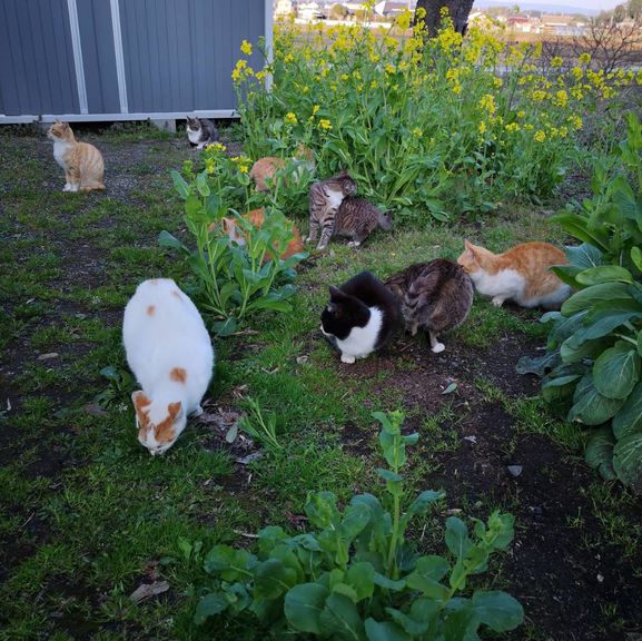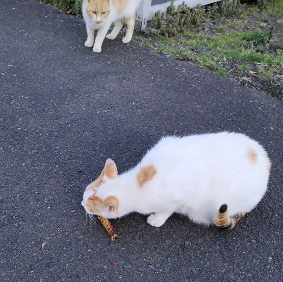ネコちゃん達は人になついており、手を出すと近寄ってきます🐈おみやげにちょっとだけササミを差し上げました😊
