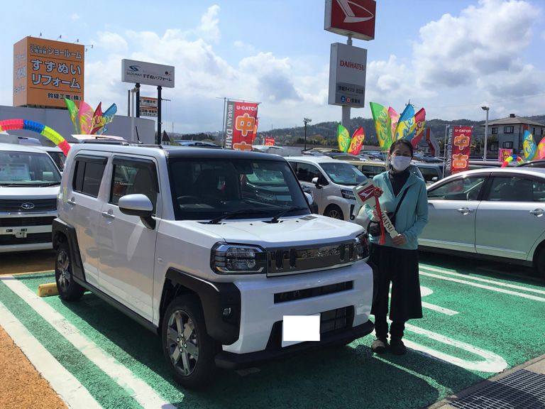 この度は、タフトのご納車誠にありがとうございました!パールホワイトのタフトに、ダークブラックのメッキでとってもかっよく仕上がってますね✨お仕事やレジャーにタフトが役立ってくれることを願ってます(^O^)!今後とも末永いお付き合いをよろしくお願いいたします。担当:鈴木
