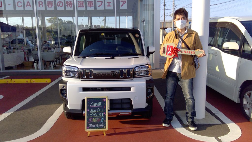 -お客様の声-タフトー!!待ってたぞー!!!この度はご納車させていただきありがとうございました!タフトが生活の役に立つことを祈っております😊今後も末永いお付き合いをよろしくお願い致します☆担当:小川