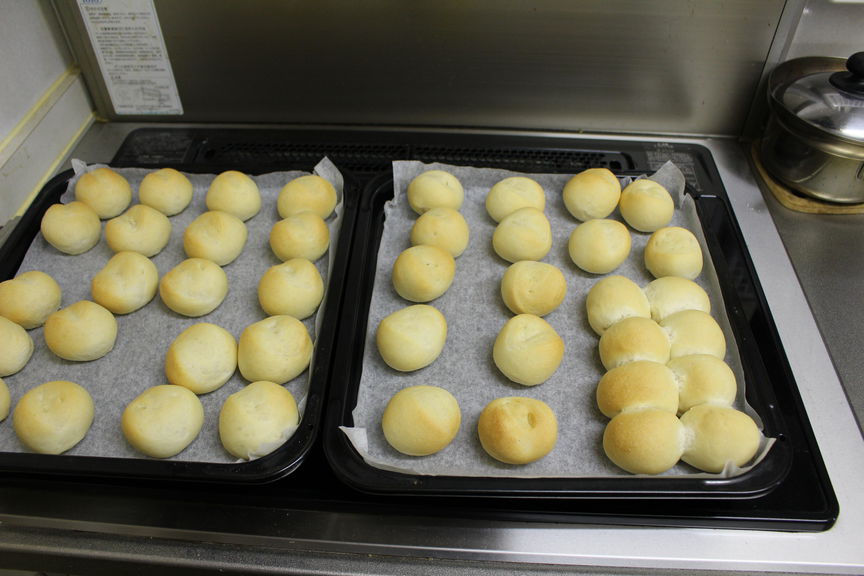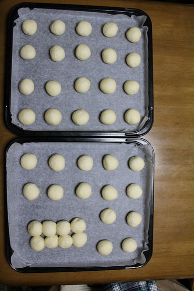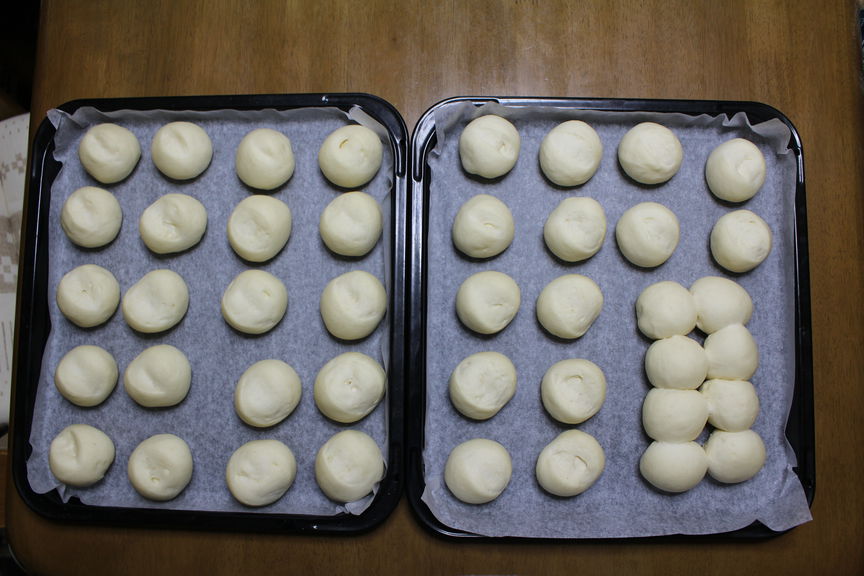 (生地をつぶす)し小分け&成型 バットに並べて2次発酵です(39度のオーブンで50分)