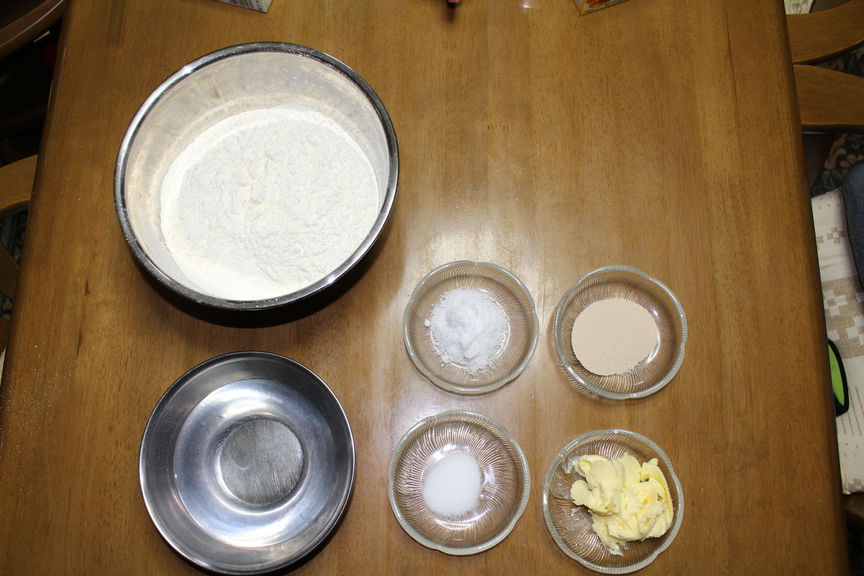 強力粉400g 薄力粉100g 塩5g バター(マーガリン)50gを入れ混ぜる。
