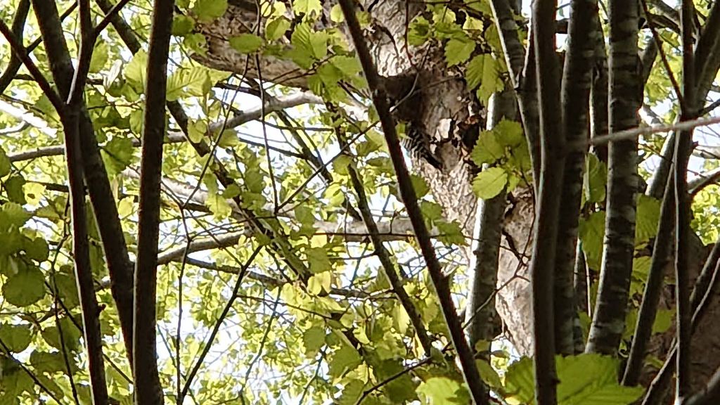 散歩中に頭上から”コンコンコン”と音が聞こえるのに子供が気付いてよく見てみると、キツツキが穴を空ける場所を探していました!どこに居るかわかりますか!?