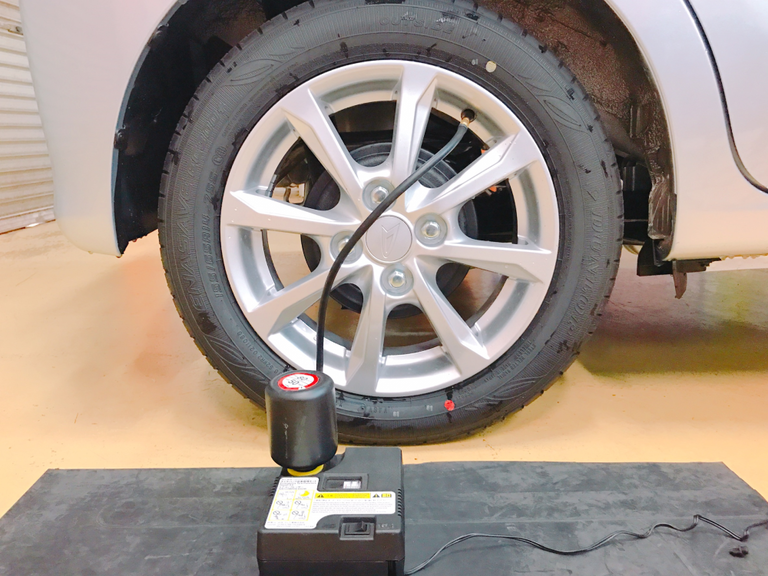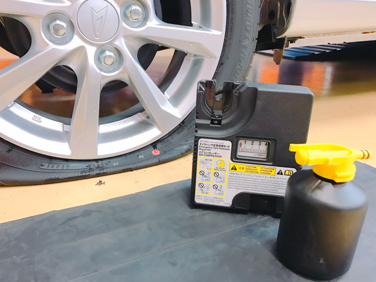 さっそくタイヤパンク応急修理キットを使い、応急修理してみます!