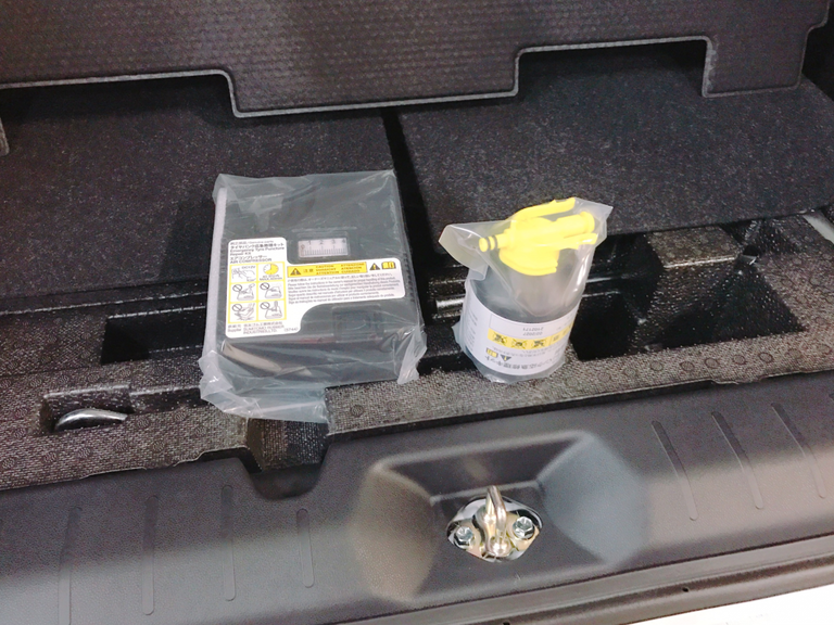 かわりに”タイヤパンク応急修理キット”となるものが搭載されています。