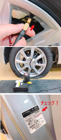 タイヤのバルブにホースをつけて~空気圧適正値を確認!(運転席のドアを開けたところに貼ってます)