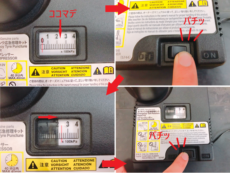 電源「ON」して適正値まで空気を入れます!一緒に修理溶剤も注入。適正値まで入ったら「OFF」