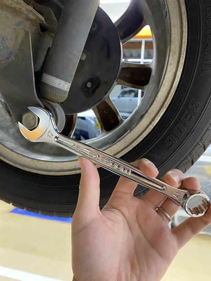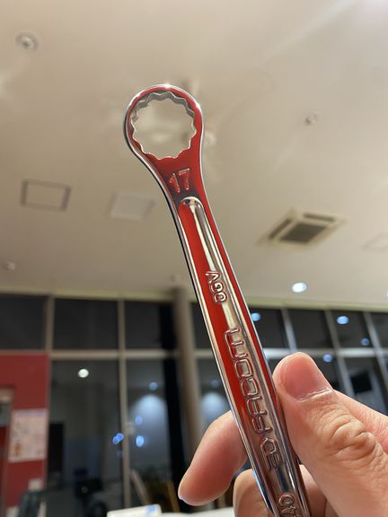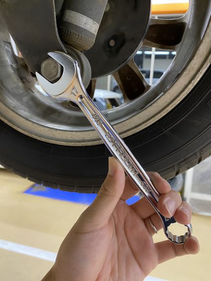 あ、ちなみにこんな大きいサイズのボルトはかなり固く閉まっている事が多く、最初からスパナ側で緩めようとするとボルトの頭を痛めますのでこちらのメガネ側でカキンと緩めてから使用してくださいね(笑)せっかくのコンビレンチなので上手に使いましょう!!それでは今回はこれにて失礼いたします(。-`ω-)